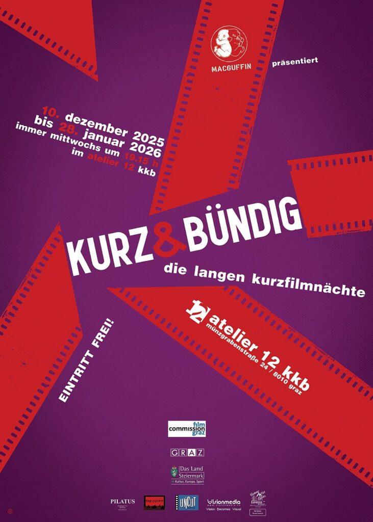 Ab dem 10.12.25 bis zum 28.01.26 findet jeden Mittwoch um 19.15 Uhr wieder die neue Reihe von „KURZ & BÜNDIG – Die langen Kurzfilmnächte 2025/26″ im Kulturverein Atelier 12 KKB statt!